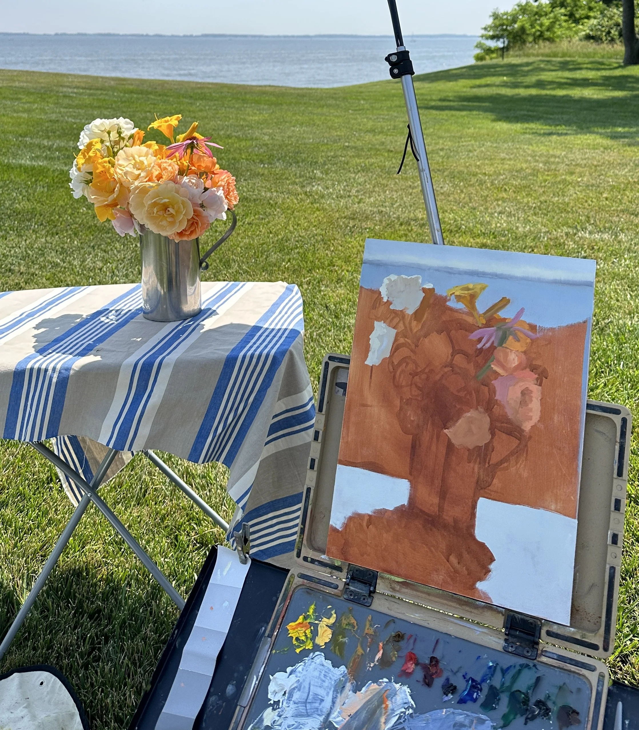 My flower paintings are inspired by my garden in Annapolis, Maryland. I love watching how flowers shift and evolve outdoors. My floral paintings are inspired by how they lean into the light, move in the breeze, and bloom with color and texture. I’m equally drawn to how flowers’ visual language changes when I cut, arrange, and bring them inside. In those flower paintings, the blooms become anchors of attention in a bouquet or when placed thoughtfully in a room.