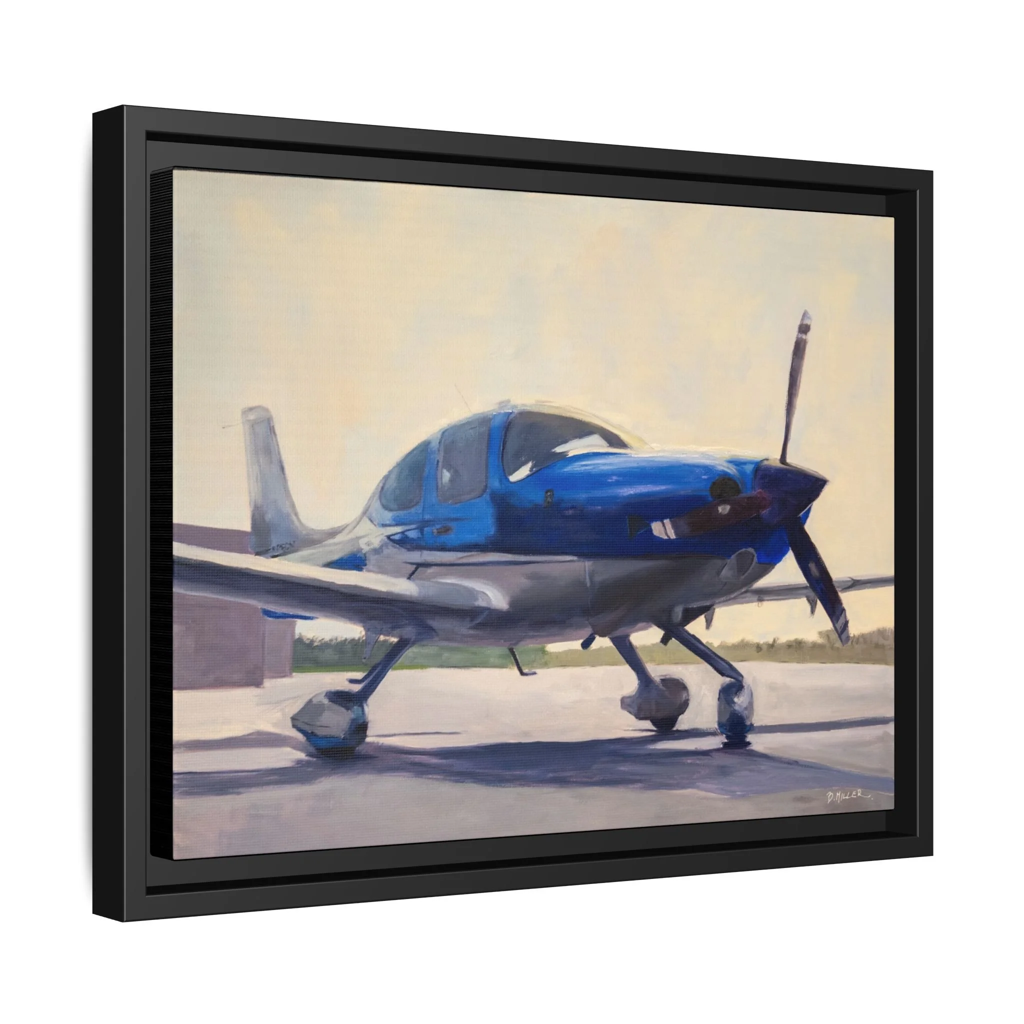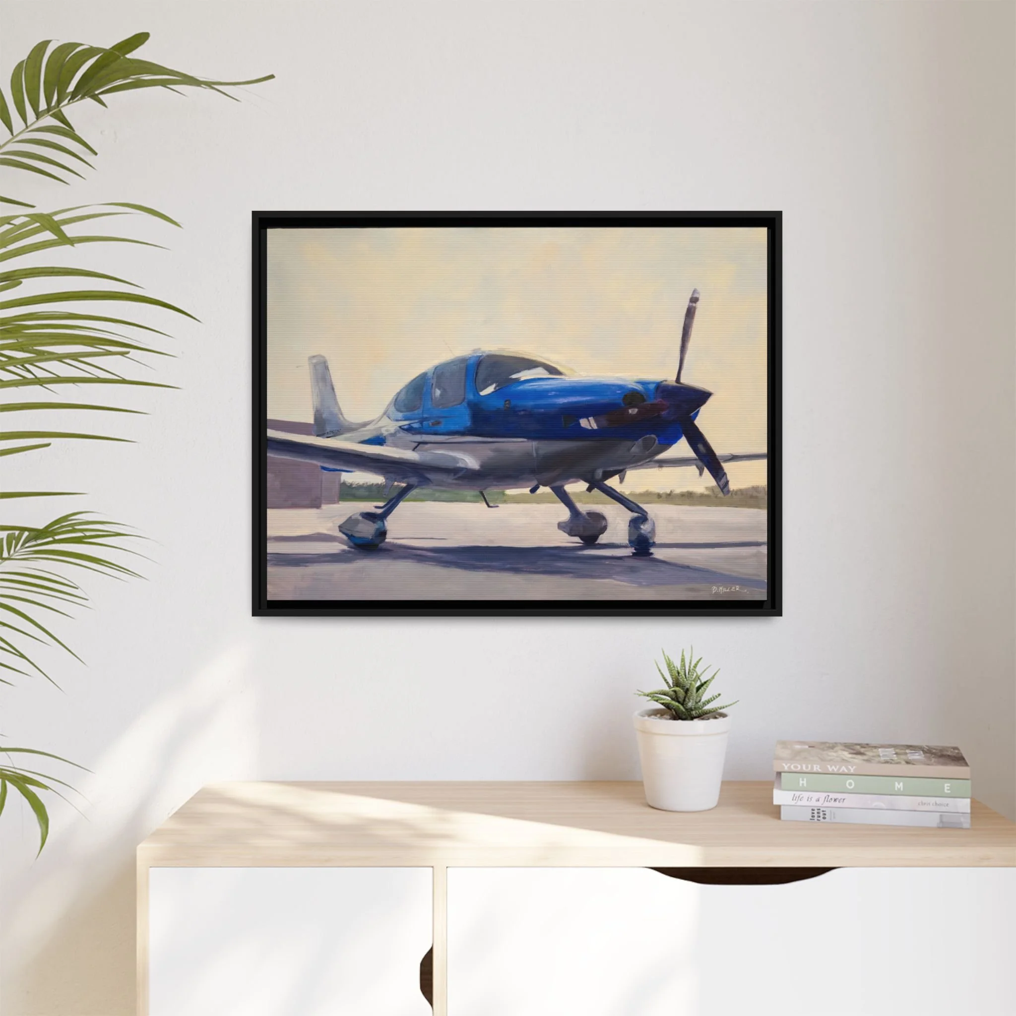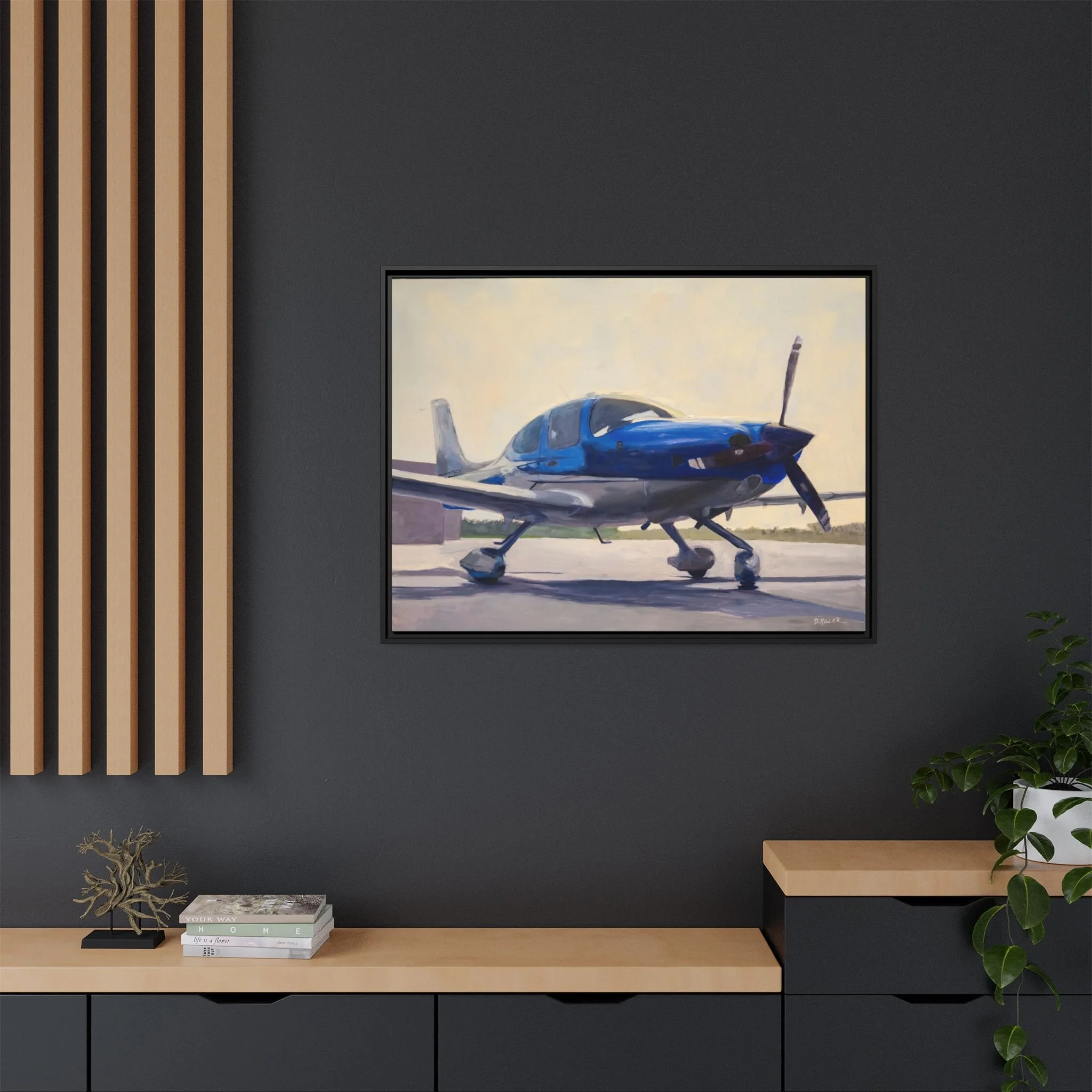 A dramatic painting of a Carbon Blue Cirrus SR22 posed on the tarmac, perfect for aviation enthusiasts and art lovers. This matte canvas print is framed in multi-color options, adding a unique touch to any space. Ideal for gifting on birthdays, Christmas, and Father's Day.