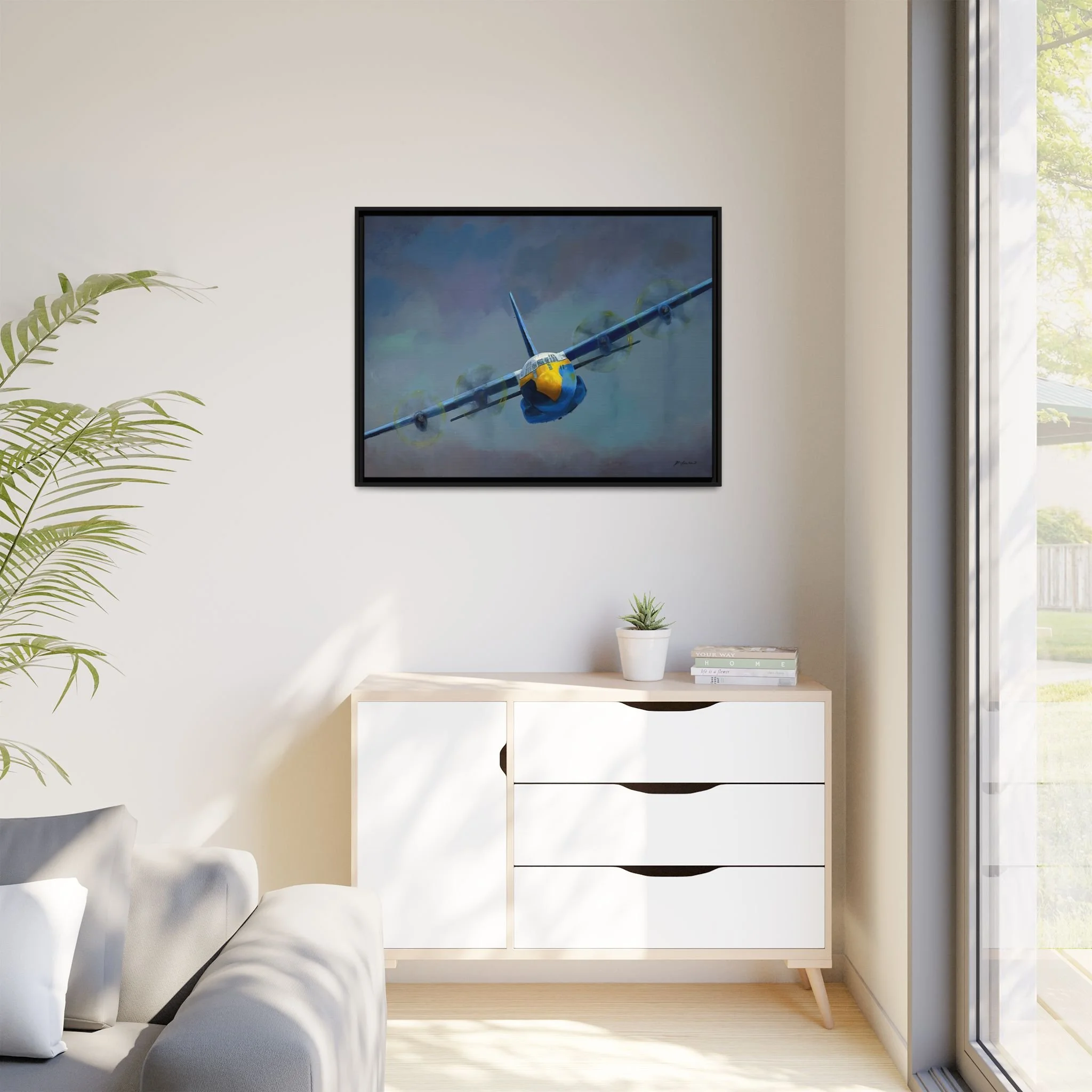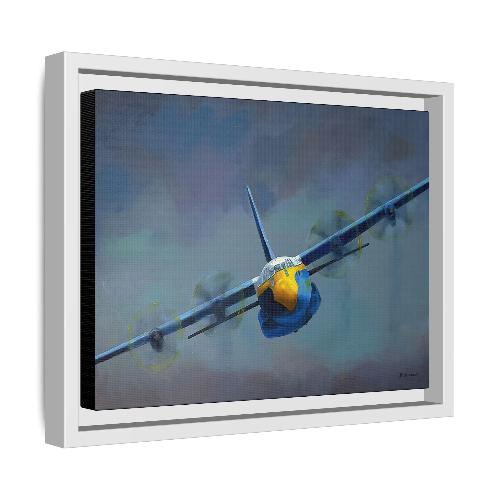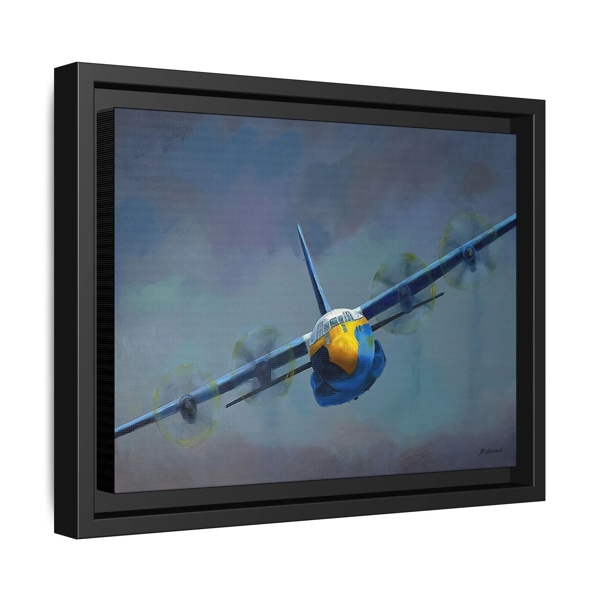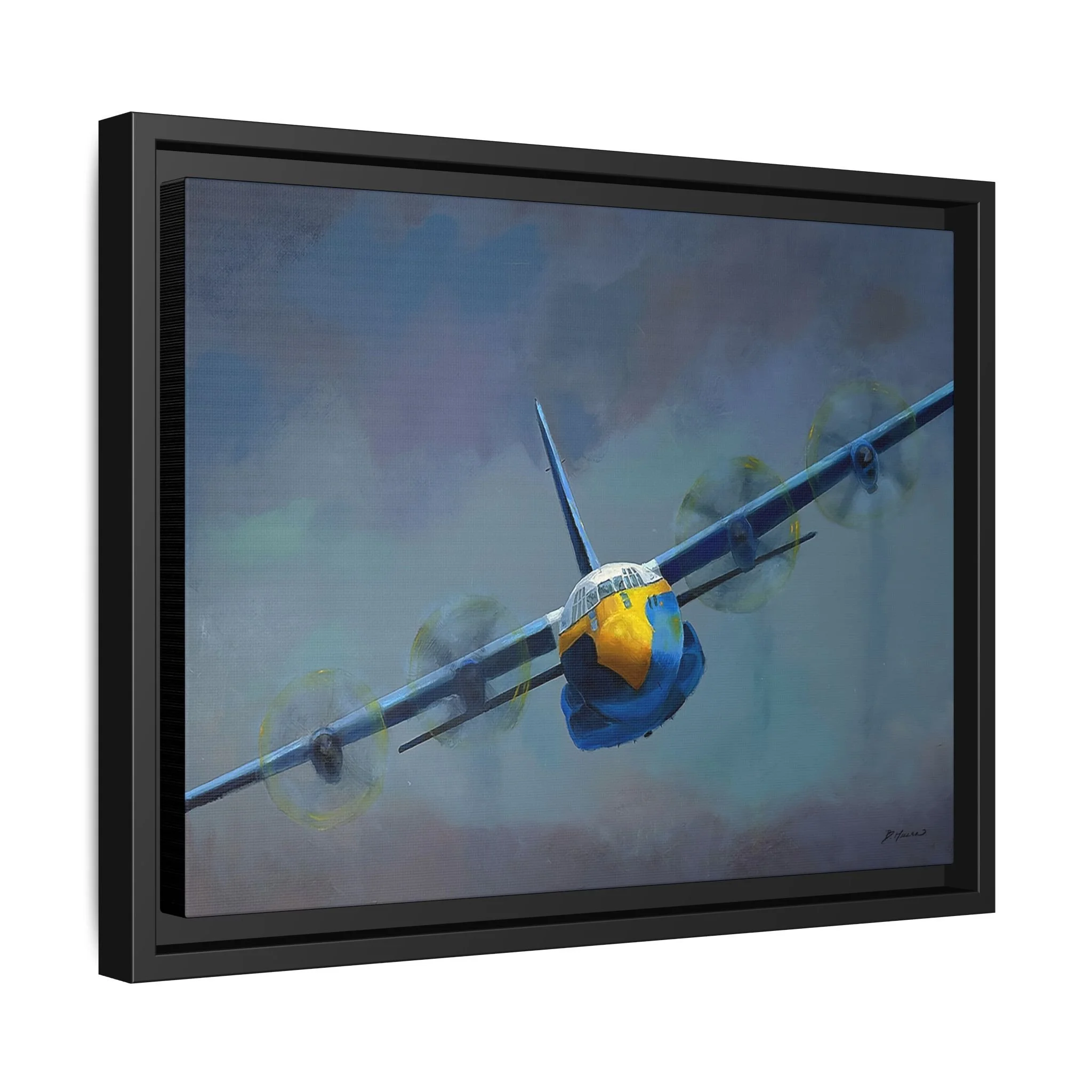 A dramatic painting of Fat Albert, the epic C130 as it flies low and slow and the beginning of a Blue Angels performance over the Naval Academy in Annapolis, Maryland. A perfect print for aviation enthusiasts and art lovers. This matte canvas print is framed in multi-color options, adding a unique touch to any space. Ideal for gifting on birthdays, Christmas, and Father's Day.